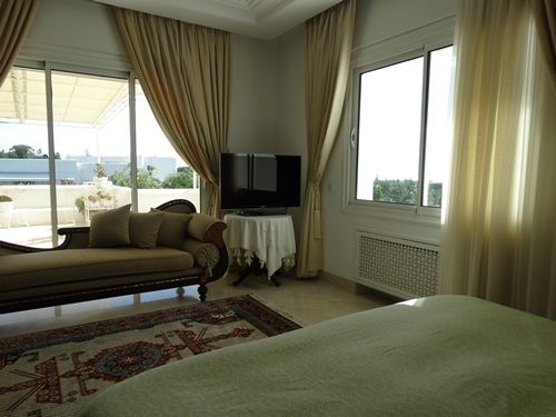Quant à l'étage il y'a une suite avec un balcon, une deuxième suite parentale avec une grande salle de bain et une belle terrasse aménagée avec un escalier privé donnant sur la piscine et le jardin, cette terrasse sous forme d'un solarium, est un chef-d’oeuvre, bénéficiant d’une vue dégagée sur toute la ville d’hammamet avec sa plage et les environs avec une vue panoramique sur les collines et les vergers.