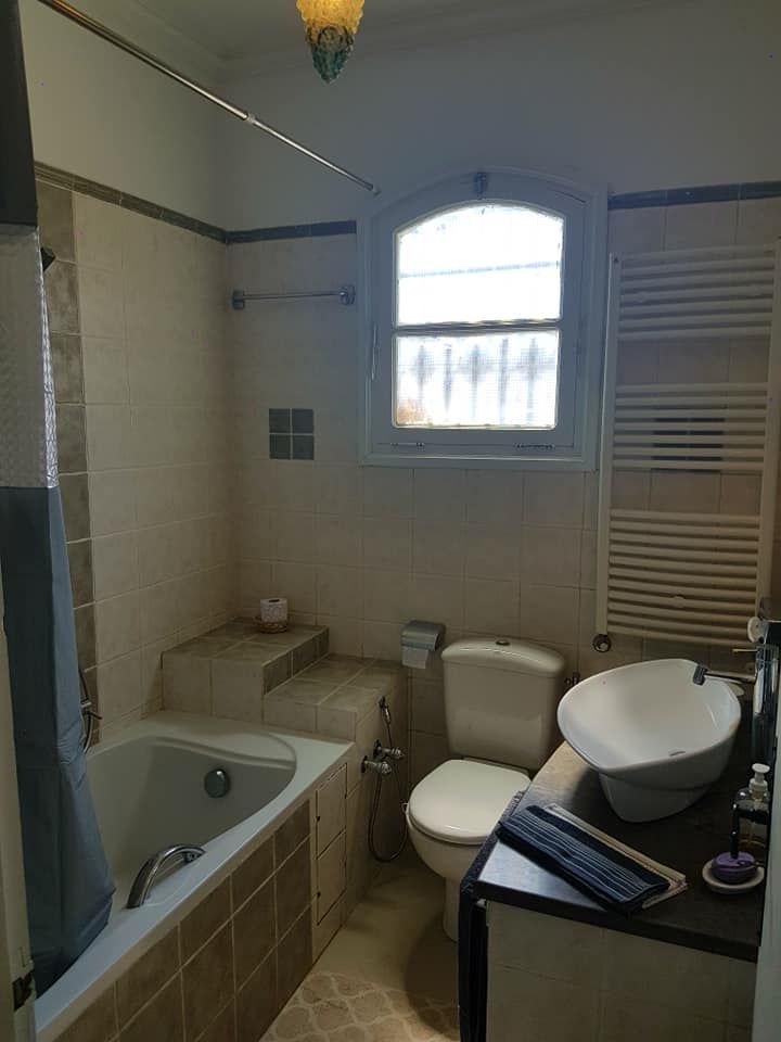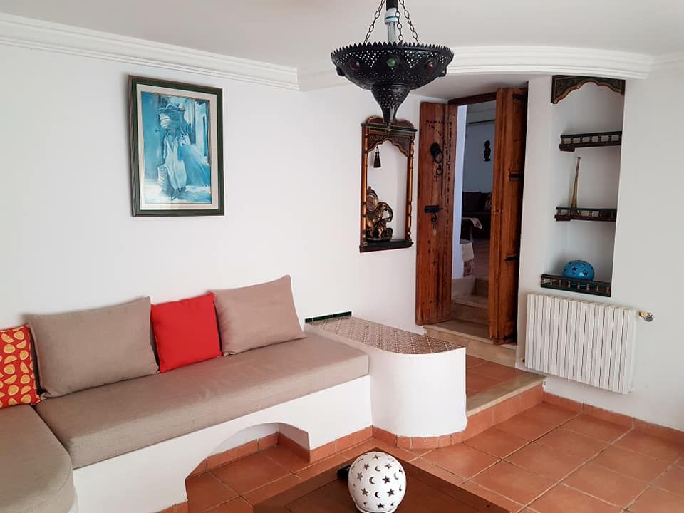 un salon lumineux et bien airée qui donne sur un terrasse; un salon d’été style marocain; une salle à manger; trois chambres à coucher qui ouvrent sur un spacieux terrasse de 70 m² ( non couverte ) une cuisine bien agencée et aménagée