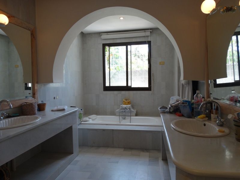 La villa comporte des pertinences extérieures telles que des terrasses, un jardin gazonné, des coins couverts et aménagés, un terrain tennis, ainsi qu’une piscine. Grâce à la disposition des espaces et aux volumes généraux, cette maison se prête à plusieurs personnalisations.