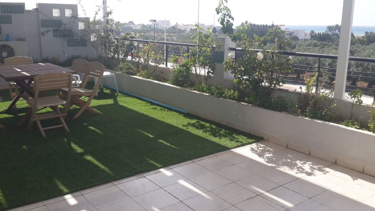 A vendre chez notre agence TPS IMMOBILIERE Hammamet, un joli appartement d’haut standing au 1er étage d’une belle résidence gardée situé à Hammamet Nord - Mrezka. L’appartement est de 124m², il s’ouvre sur une belle terrasse de 30m² avec une panoramique vue sur mer. Il est composé d’un spacieux salon donnant sur la terrasse, trois chambres à coucher, une salle de bain et une cuisine moderne installée et équipée.