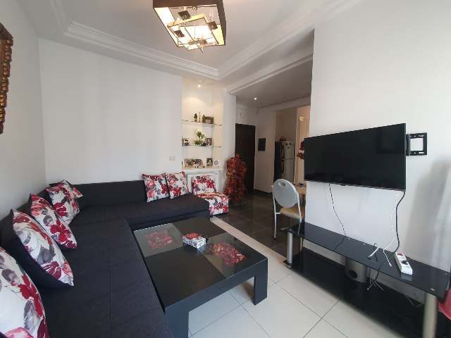 L'appartement comporte un salon très lumineux qui s'ouvre sur un balcon, une belle cuisine bien équipée en état neuf, deux chambres à coucher et une salle de bain avec une baignoire et toilettes.