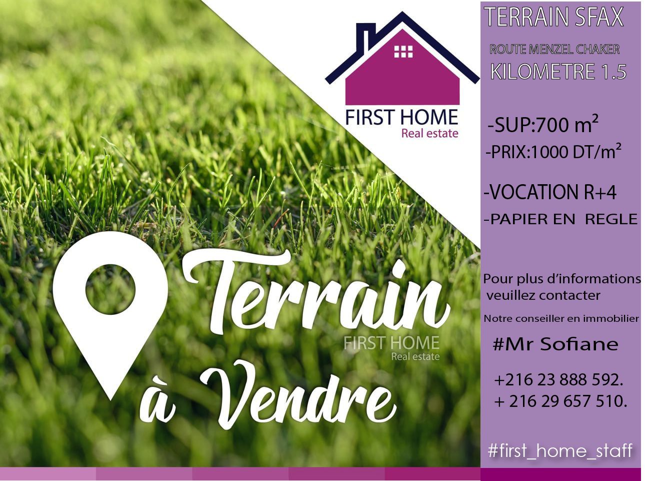 A vendre un Terrain à Menzel Chaker Km 1.5 Sfax. Sup Terrain : 700 m²Prix de vente : 1000DT/m²-TITRE INDIVIDUEL.-VOCATION R+4.Pour plus d'informations veuillez contacter Mr Sofiane au +21623888592