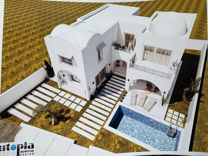 A vendre chez l'agence TPS Immobilière Hammamet, une belle villa avec piscine alliant le style contemporain avec le style arabesque qui s’étend sur un terrain de 591m², bien située à Hammamet vers la route de vers Birbouregba dans un quartier verdoyant et calme.