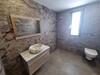 La villa est composée au rez de chaussée d’un salon en double hauteur en partie, donnant sur la piscine et le jardin, un séjour, une cuisine aménagée et une SDD.