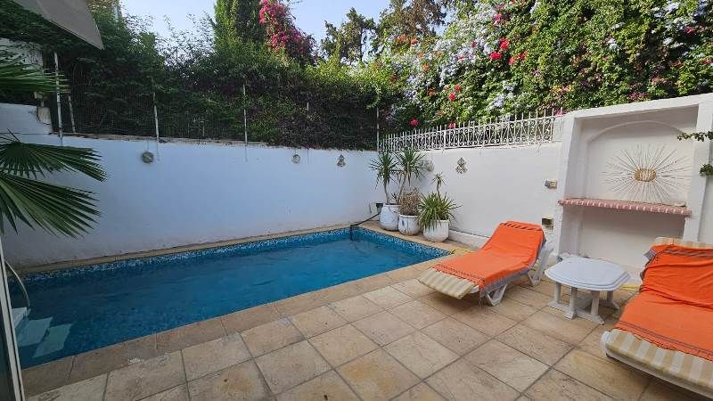 A louer pour des courte durée chez l'agence TPS IMMOBILIERE Hammamet, une charmante petite maison au style arabe, avec une piscine et un beau jardin, située dans un quartier cartier calme et résidentiel à Hammamet-zone Sindbad.